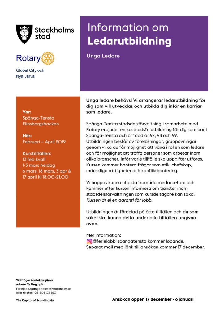Vi har under två år bedrivit en ungdomsledarutbildning i Järva i samarbete med Stockholms stad. Den kommer fortsättningsvis att ske i samarbete med Fryshuset och Värmdö skärgårds RK. Vi genomför även sedan fem år en årlig en internationell ledarutbildning för unga professionella – International RYLA i samarbete med det polska Rotarydistriktet.( http://intrylazone1718.org)