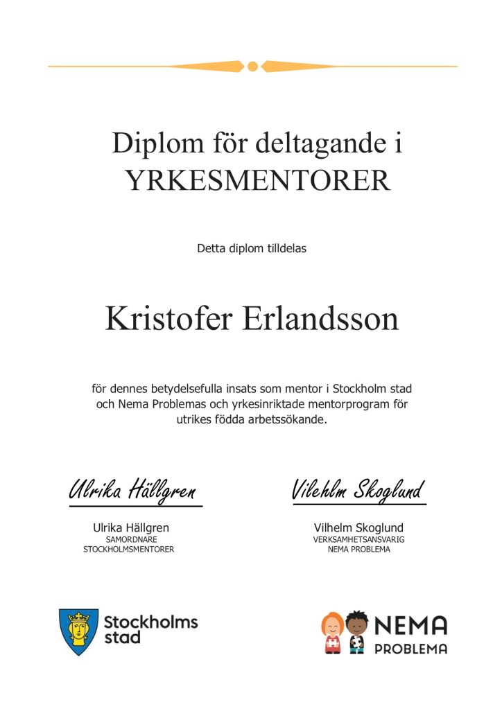Flera av oss är mentorer till nyanlända högutbildade eller ungdomar inom ramen för Stockholms stads s k Integrationspakt.